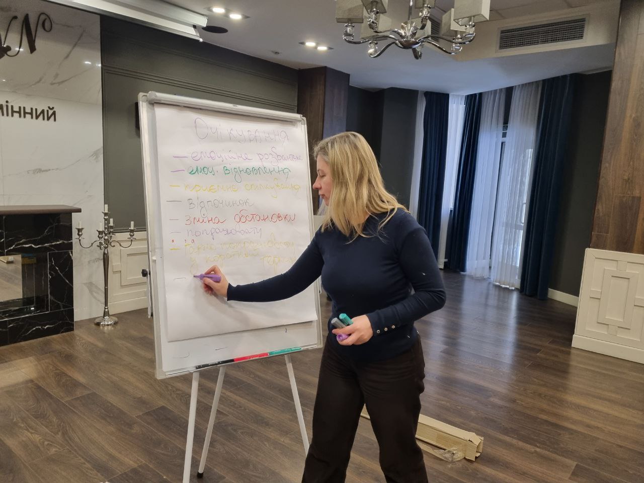 Серед практичних занять – вправи на делікатну самодіагностику стану, робота з проявами вигорання в малих групах, розвиток резильєнтності та копінг-стратегій, напрацювання відчуття безпечного робочого середовища, вправи на відновлення внутрішніх опор і переосмислення особистих орієнтирів та цілей. Програма поєднала рефлексивні, тілесні та когнітивні підходи – у доступному, підтримуючому форматі, з великою кількістю практики.